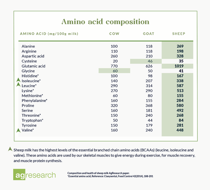 Let’s start with the basics. Sheep milk offers superior nutritional benefits compared to both goat and cow milk, as highlighted in the AgResearch paper, "Composition and health benefits of sheep’s milk." But if we were just to say what's the difference between Sheep milk and Goat milk, Sheep milk simply contains 50% more protein than goat milk, which makes it a powerful option for those looking to support muscle function, stay fuller for longer, or fuel an active lifestyle. But the benefits don’t stop at protein—sheep milk is also 54% higher in calcium compared to goat milk. Making it an exceptional source for those wanting to support strong bones and overall bone health.